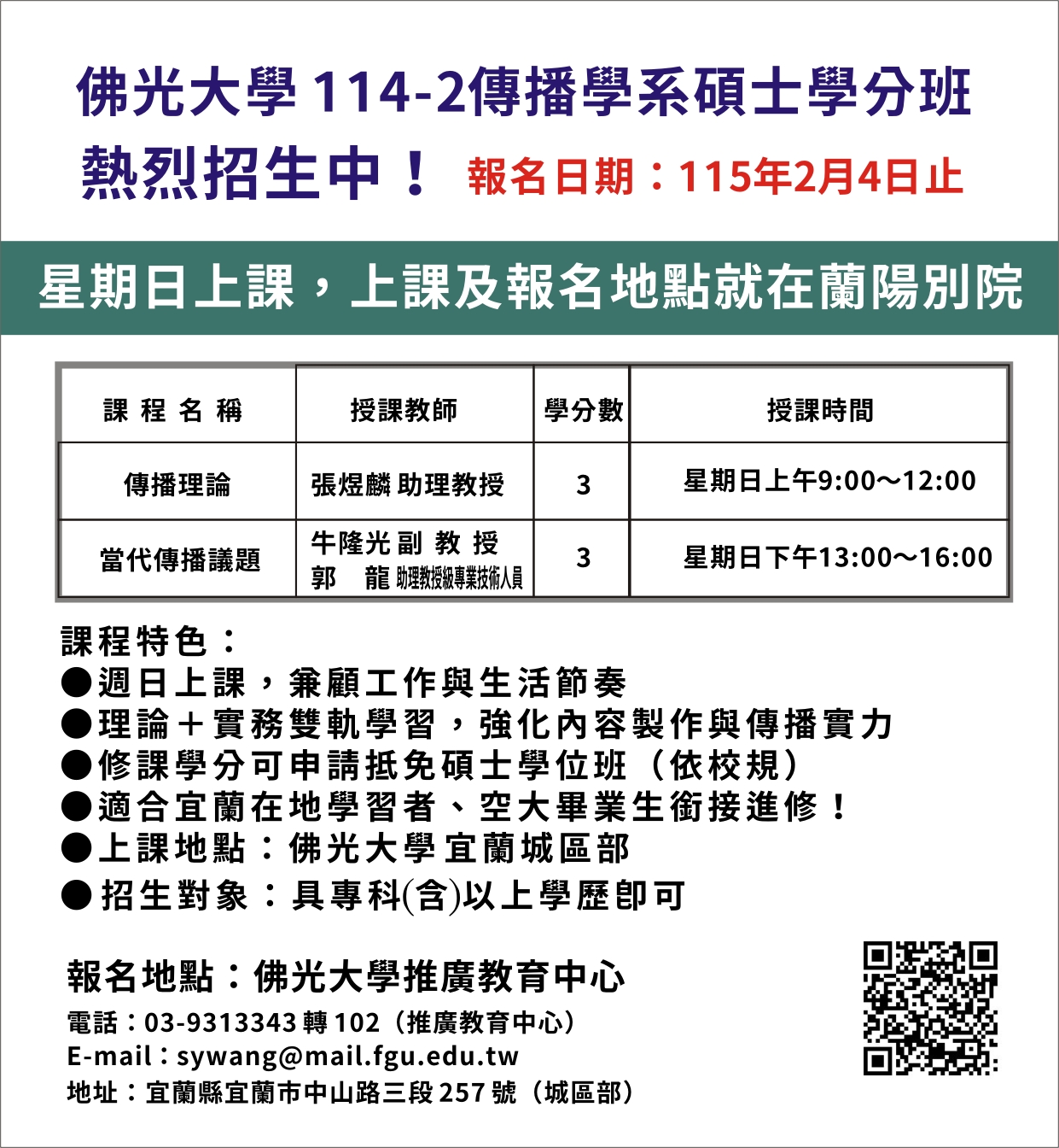 掌握數位時代傳播力!佛大傳播系碩士學分班熱烈招生中!