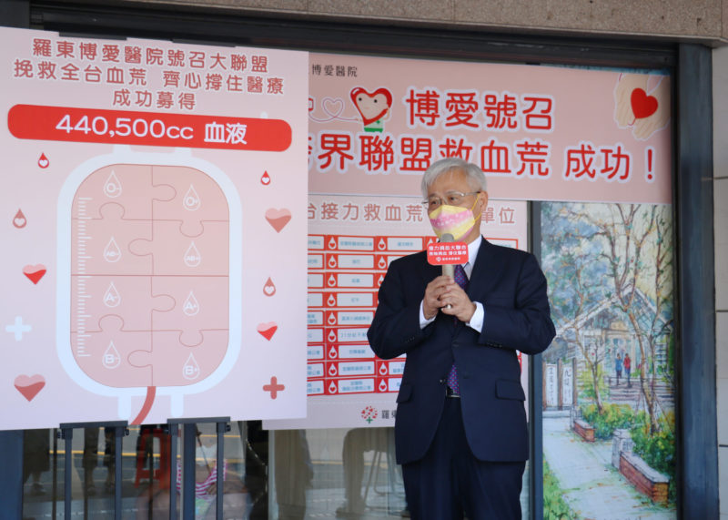 受到疫情衝擊,降低民眾捐血意願,讓全台血庫血液存量亮紅燈。為了拯救血荒,羅東博愛醫院6月16日號召宜蘭縣民與醫療人員公會共同響應捐血,並於七月底前主辦16場次捐血活動援救全台血荒,期間贊助資金、物資與動員捐血的機關單位與民間團體,超過40家,截至7/28,共募集1,153人次、1,762包血袋,共計440,500c.c.的鮮血量,成績斐然。今(29)日羅東博愛醫院又在宜蘭捐血站舉辦成果發表會與加碼抽獎活動,血液基金會執行長魏昇堂與台北捐血中心角志宏組長亦到場共襄盛舉,共同表達對宜蘭縣民踴躍捐血的感動與感謝。
