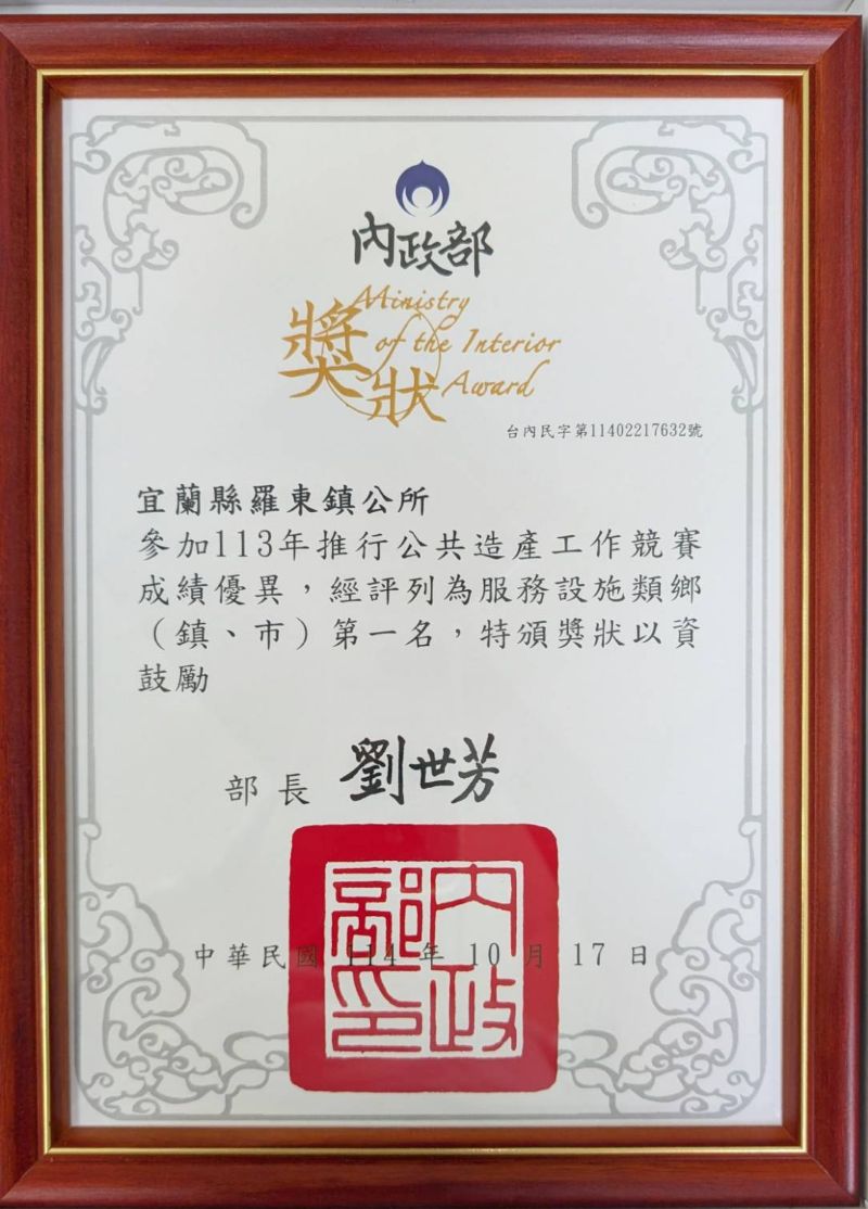 羅東鎮公所參加內政部113年度公共造產服務設施類工作競賽榮獲第一名,內政部今(17)日假宜蘭縣中興文化創意園區舉辦表揚典禮,除頒發獎項外,還獲頒獎勵金新台幣65萬元,鎮長吳秋齡親自領獎。