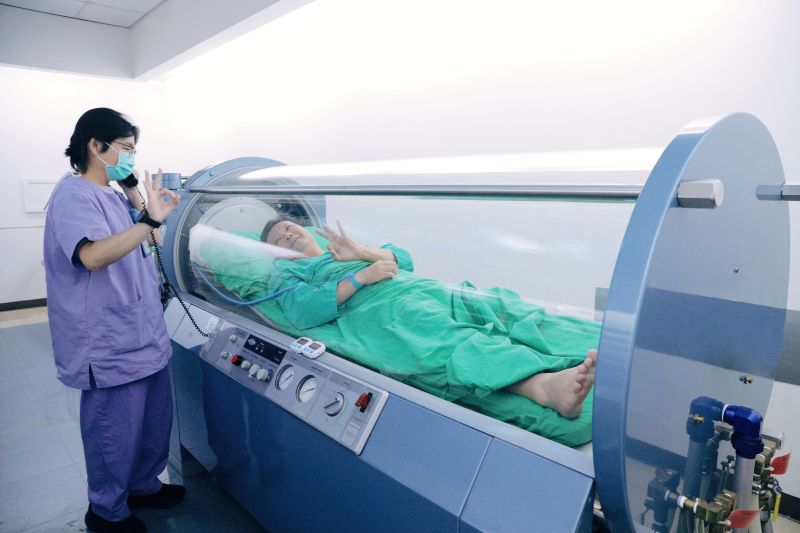 何春生主任表示,高壓氧治療是一種輔助療法,透過提高血液和組織中的氧分壓,增加缺血區域的氧氣供應,減輕腦水腫、調節炎症反應,也能促進神經修復與血管新生。病人躺臥在密閉的高壓氧艙中,透過呼吸100%純氧進行體內氣體交換。