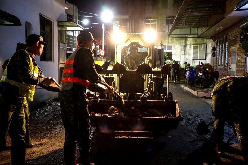 為加速地方恢復正常生活,國軍官兵以最短的時間、最高的效率投入道路清淤、廢棄物清理以及環境消毒等工作。其中,工兵部隊更在多個深夜時段化身為「黑夜騎士」扮演關鍵角色,在每個雨夜穿梭於街巷與積水區域,以機具與鏟子為受災鄉親開闢安全的回家路。