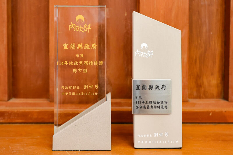 宜蘭縣政府地政處於內政部舉辦之「地政節」(114年11月11日)表揚大會上,再度以亮眼表現脫穎而出,榮獲非六都縣市組總考評「績優獎」及三維地籍建物整合建置考評「特優獎」兩項殊榮,展現宜蘭縣在智慧地政推動、地籍整合及便民服務上的卓越成果與持續進步,為本縣地政業務再添佳績。