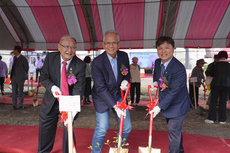 宜蘭大學校長陳威戎(右1)、仰山文教基金會創辦人游錫堃(中)及校友總會理事長陳俊雄(左1)共同植下象徵百年願景的樹苗。(照片/宜蘭大學提供)。