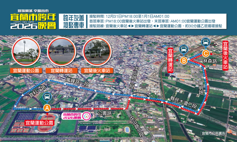 跨年晚會當天,除了有精彩的表演,現場也規劃了市集,提供美食與特色攤車,讓民眾在音樂與美食間自在穿梭,而為了便利民眾前往會場,市公所自12月31日晚上6點起至元旦凌晨1點,提供免費接駁車3輛,串接「宜蘭後火車站」、「宜蘭轉運站」與「宜蘭運動公園」三站點環狀巡迴接駁服務。