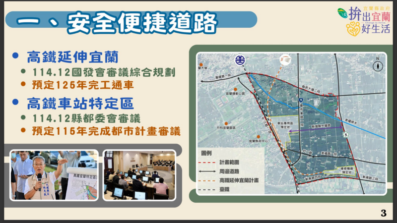 在交通建設方面,縣府取得多項具體且關鍵性的進展,台62線延伸宜蘭於上月通過可行性評估,高鐵延伸宜蘭及宜蘭至羅東鐵路高架綜合規劃,近期亦已通過國發會審查,無論是公路或鐵路建設,皆持續穩健推進,逐步完善宜蘭對外與縣內交通網絡,為鄉親往來通勤與返鄉出行帶來更安全、便捷的選擇。