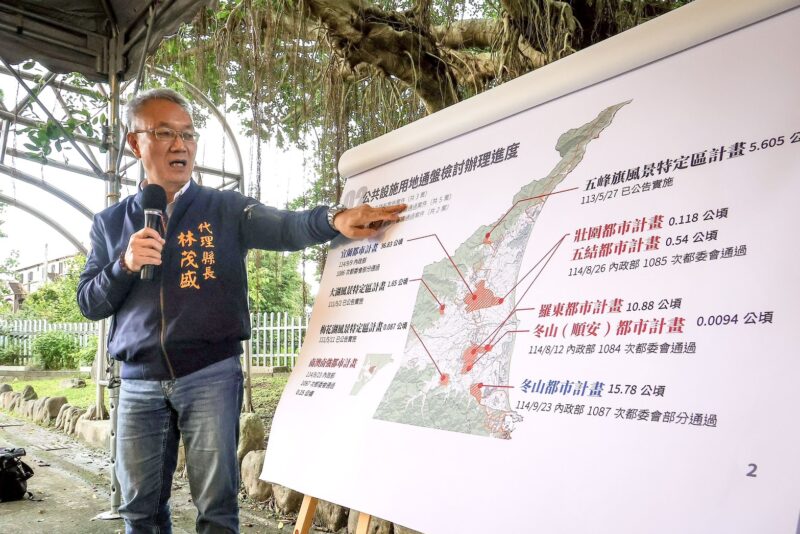 宜蘭縣都市計畫公共設施用地專案通盤檢討案於106年起開始辦理公開展覽,107年至110年全縣共有19處都市計畫案陸續報送內政部都市計畫委員會審議,全部共計檢討245處公共設施用地,檢討面積高達185公頃。這次透過通檢程序變更為住宅區、商業區、產業專用區等可建築用地,並以市地重劃方式辦理基礎設施工程,地主於分回55%之土地後,即可自行開發利用,積極落實「還地於民」。