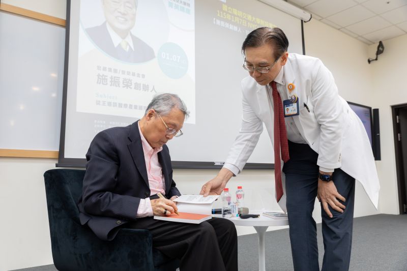 現場邀請施創辦人幫陽明交大醫院簽書留念。(照片/陽明交大醫院提供)。