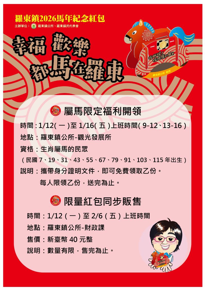 羅東鎮公所表示: 凡生肖屬馬的民眾(民國7、19、31、43、55、67、79、91、103、115年出生),可於1月12日(星期一)至1月16日(星期五)上班時間(9-12、13-16),攜帶身分證明文件至羅東鎮觀光發展所免費領取馬年紀念紅包乙份(每人限領一份,送完為止)。