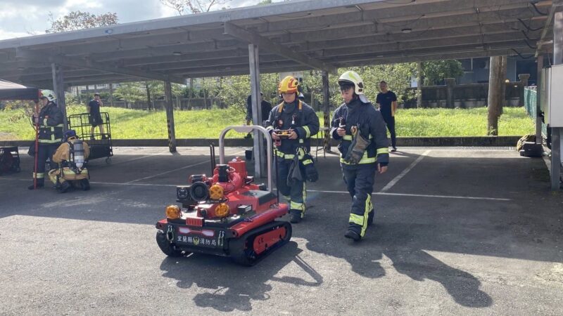 現場亦投入紅外線熱顯像空拍無人機及救災機器人,運用消防科技,進行遠端監控及火點偵查,指揮官可透過救災平板,查詢偵蒐畫面、救災車輛、人員、水源、平面圖等重要資訊,輔助救災決策,提升作業效率,展現宜蘭縣消防科技救災實力。