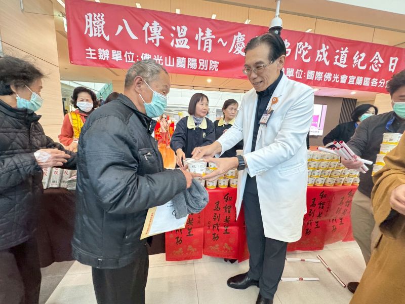 黃志賢院長與蘭陽別院妙勤住持一起發放臘八粥及墨寶給醫院就醫民眾。