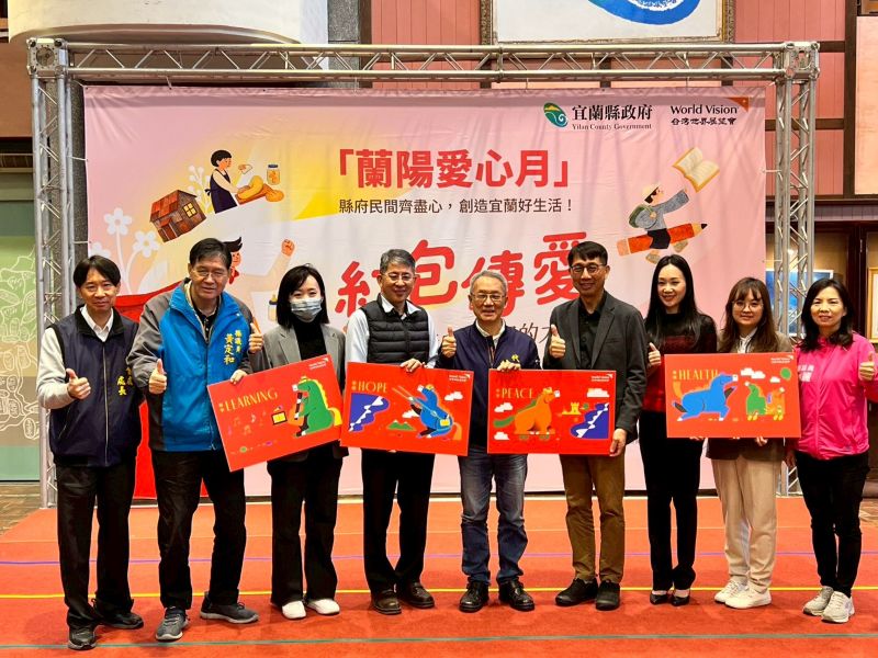 農曆年將至,為幫助在地弱勢兒少與家庭度過艱難時刻,台灣世界展望會與宜蘭縣政府今(27)日在宜蘭縣政府縣民大廳舉辦「蘭陽愛心月-紅包傳愛」公益記者會,宜蘭縣代理縣長林茂盛、議長張勝德、議員黃定和、林麗、社會處林蒼蔡處長以及愛心企業和社會大眾,一起為1,500名宜蘭弱勢兒少募集「助學、健康、平安、希望」四種祝福紅包,讓弱勢兒少過個好年!