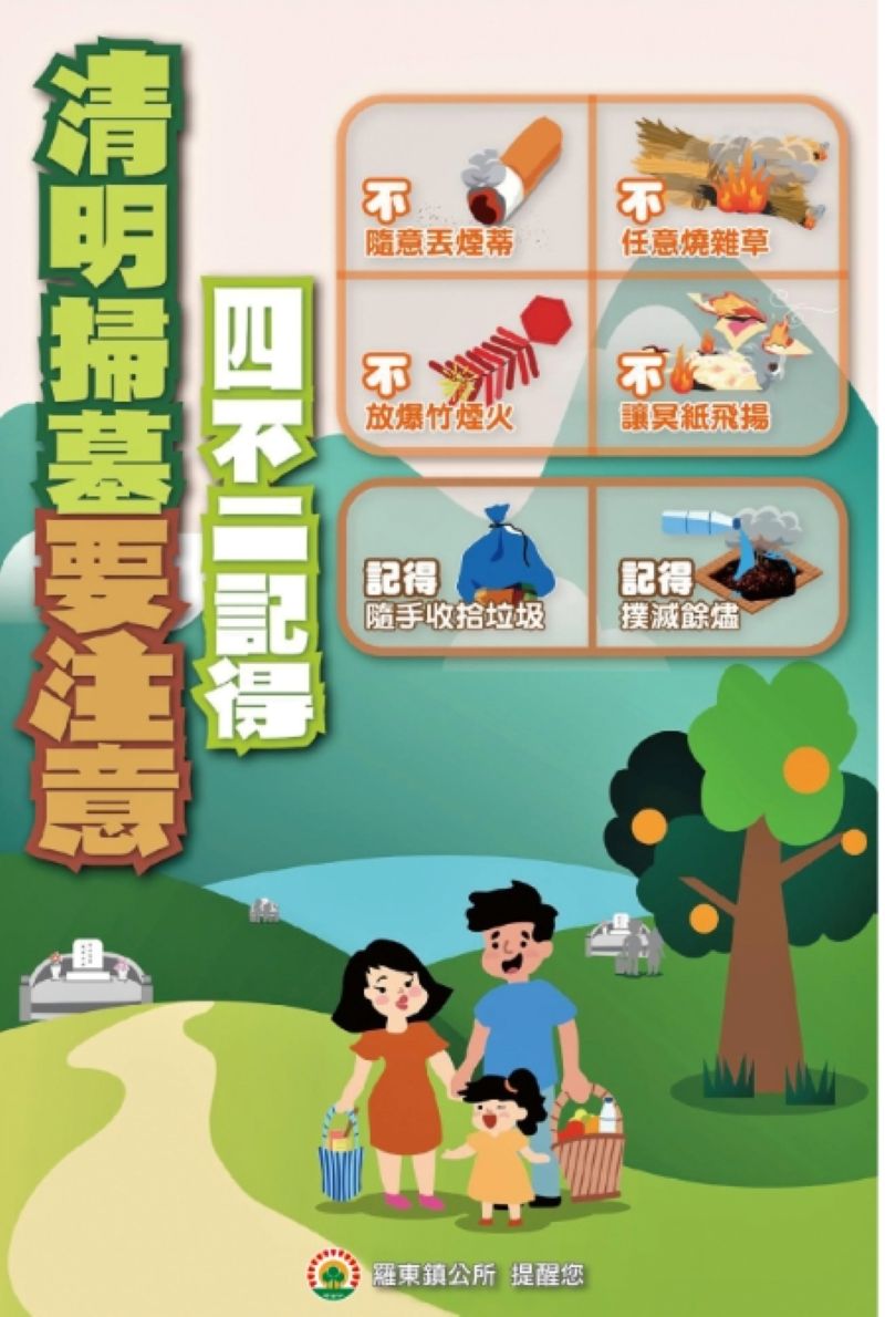 另鎮公所呼籲掃墓民眾務必落實「四不」、「二記得」,即不燒雜草、不亂丟菸蒂、不亂撒冥紙、不燃放爆竹,務必記得熄滅灰燼、記得帶走垃圾,確保公共安全。