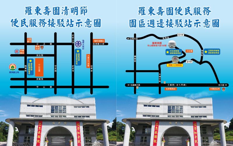 為便民服務,鎮公所於3月21、22、28、29日及4月3、4、5、日共7天於「玉尊宮停車場」進行接駁。前述日期壽園納骨塔提早於上午7時開放民眾祭拜。本年度「東興科技」無設置接駁站。另3月22日春祭法會當日則提供「羅東火車站」及「中山公園」至壽園免費接駁服務。