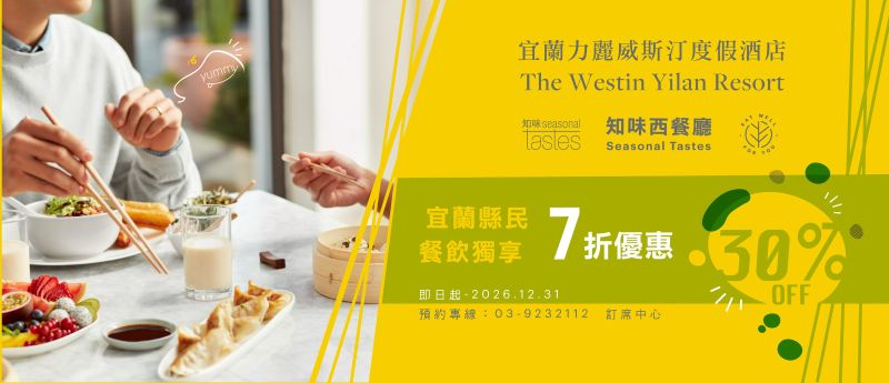 另外,宜蘭力麗威斯汀度假酒店知味西餐廳即日起也推出餐飲獨享優惠活動,只要是宜蘭縣民就可享7折優惠,優惠期間自即日起至12月31日止,預約專線:03-9232112。