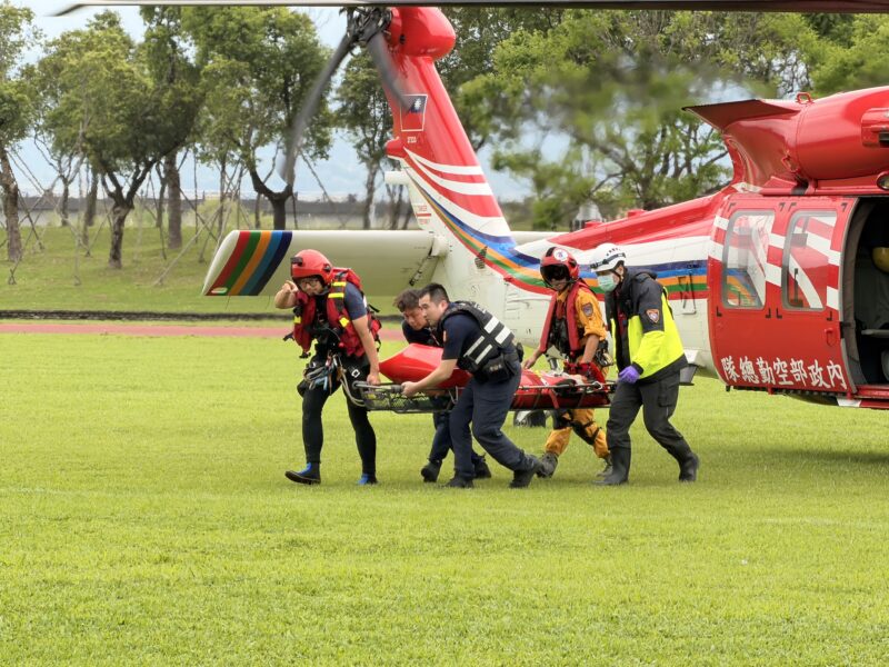 空勤直升機將傷者送至羅東運動公園田徑場,隨即由救護車送往羅東博愛醫院治療。(照片/宜蘭縣消防局提供)。