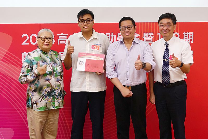 去年在全國賽獲得「最佳辯士」獎項的宜中校友許捷元,今年以評審身份回歸。(圖左起:林燈基金會林純美總執行長、宜中校友許捷元同學、中保科技集團副總裁林明昇、蘭陽女中陳銓校長)。(照片/林燈文教公益基金會提供)。